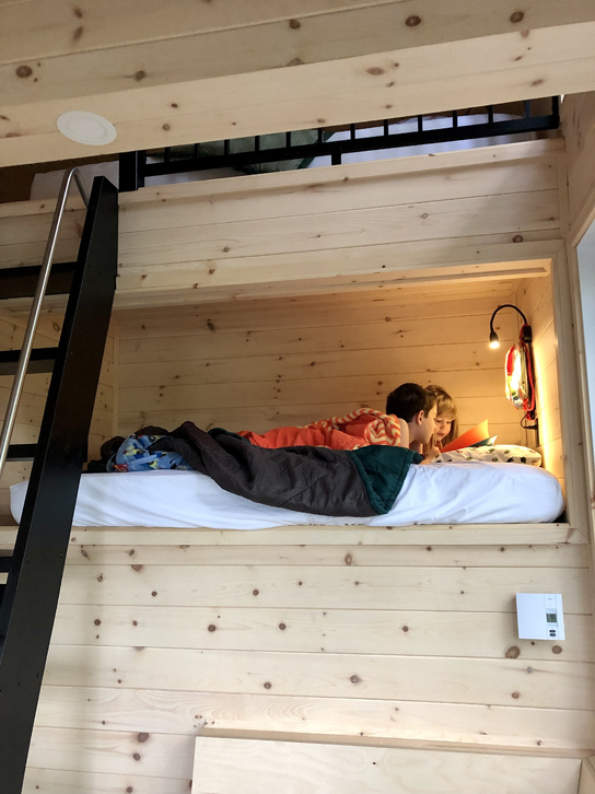 Pour notre part, nous avons été surpris par la pluie lors de notre séjour, mais cela ne nous a pas empêchés d’aller faire une randonnée en forêt! Après une longue balade accompagnés de l’enivrante odeur de la pluie, nous sommes revenus à notre minimaison tout trempés, mais ravis de nous faire un bon chocolat chaud. Les enfants se sont amusés à nous faire un spectacle d’ombres chinoises et nous en avons profité pour sortir nos jeux de société.