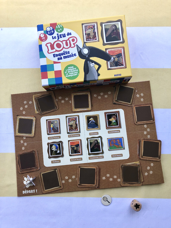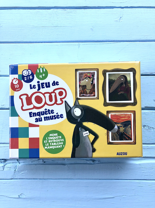 Voilà un autre jeu que nous avions bien hâte de découvrir, parce que nous aimons beaucoup les histoires de Loup! Inspiré du livre Le loup qui enquêtait au musée, ce jeu proposé par les éditions Auzou est un jeu de mémoire un peu différent, dont les parties se jouent assez rapidement.