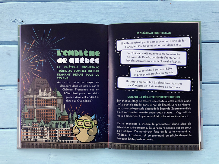 Les bleues de Québec s’adresse aux jeunes de 7 ans et plus et vous donnera très certainement envie de retourner visiter la belle ville de Québec! En compagnie de leurs patates favorites (les jumeaux, l’artiste, la branchée, la geek, le cuistot et la rebelle), vos jeunes apprendront des détails historiques fort intéressants sur plusieurs endroits phares de la ville comme la place Royale, la rue du Petit Champlain, la terrasse Dufferin, les plaines d’Abraham, le Château Frontenac ou la rivière Saint-Charles. Ils redécouvriront aussi le Carnaval de Québec, certaines expressions québécoises, trouveront des idées d’activités à faire à l’école ou à la maison, des devinettes, et même une recette de tarte au sucre…