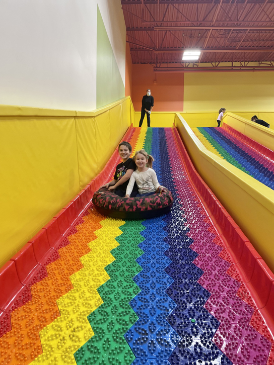 Depuis notre dernier passage, le coin des trampolines a été remplacé par la zone arc-en-ciel, qui comprend des glissades sur tubes et une montagne de blocs géants pour faire des constructions. Je vous laisse deviner avec l’aide de nos photos si les enfants apprécient… 😉