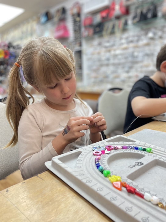 Notre fils était certain, au départ, que l’activité plairait plus à sa soeur, mais devinez quoi… C’est lui qui veut absolument y retourner pour faire des bracelets pour accompagner son nouveau collier!