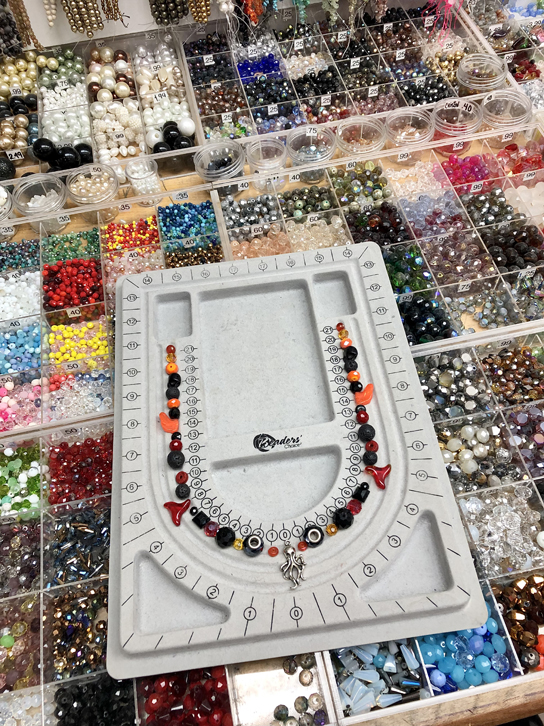 Dans un premier temps, à l’aide d’un plateau d’assemblage, on choisit les billes que l’on souhaite utiliser pour créer notre bijou, tout en classant une bille «exemple» dans un second plateau de tri, pour calculer le prix de chacune d’entre elles. Il y a tellement de possibilités!