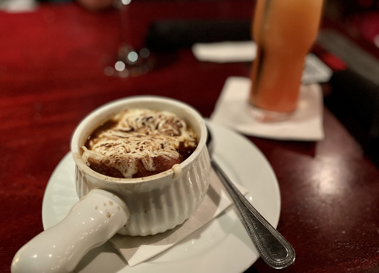Alors que j’opte pour une entrée de soupe à l’oignon à la bière, mon conjoint y va pour la totale (après tout, c’est lui qui conduisait toute la journée sous la forte pluie et le brouillard): une assiette comprenant à la fois du steak et des côtes levées, ainsi qu’une énorme pomme de terre farcie!