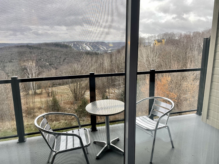 Ici aussi, l’atmosphère est accueillante et chaleureuse. Nous allons nous reposer dans une chambre supérieure avec deux lits Queen: quel bonheur! À notre disposition, il y a également un petit frigo, un micro-ondes et une cafetière Nespresso, sans oublier un balcon qui nous donne une vue splendide sur les pistes de ski.