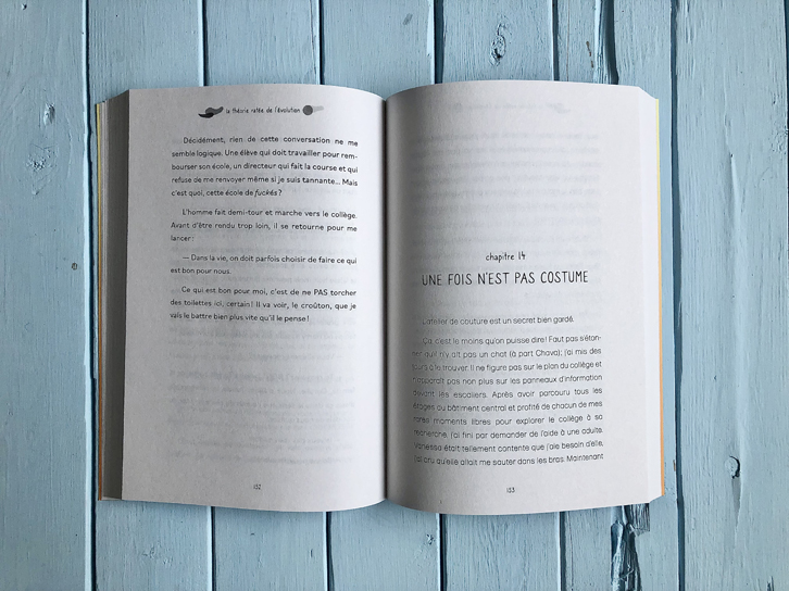 La théorie ratée de l’évolution a la particularité d’être un livre coécrit par deux auteures: cela nous permet d’ailleurs une lecture fort intéressante puisque, d’un chapitre à l’autre, on alterne entre les points de vue de Coralie (la TDAH survoltée) et de Carma (la cleptomane anxieuse). Même si les deux personnages ont des caractères totalement opposés, on comprend qu’elles ont toutes les deux leur place au Collège Charles-Darwin. On est aussi fort agréablement surpris par la pédagogie bienveillante du personnel du pensionnat. L’histoire nous a captivés et on a bien hâte de connaître la suite!