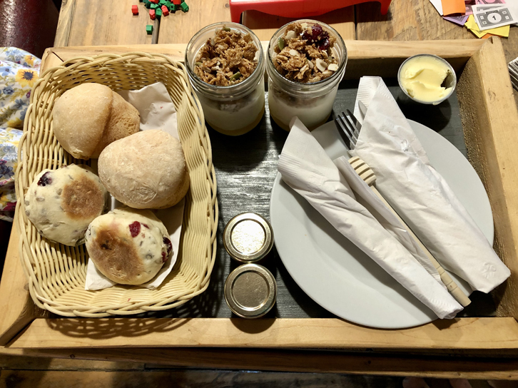 Le matin venu, Canopée Lit propose des repas à son chalet d’accueil. Le petit déjeuner est d’ailleurs compris avec l’hébergement: il s’agit d’un plateau comprenant le breuvage de votre choix, un pain et un scone, quelques confitures ainsi qu’un savoureux mélange de yogourt, fruits et granola.