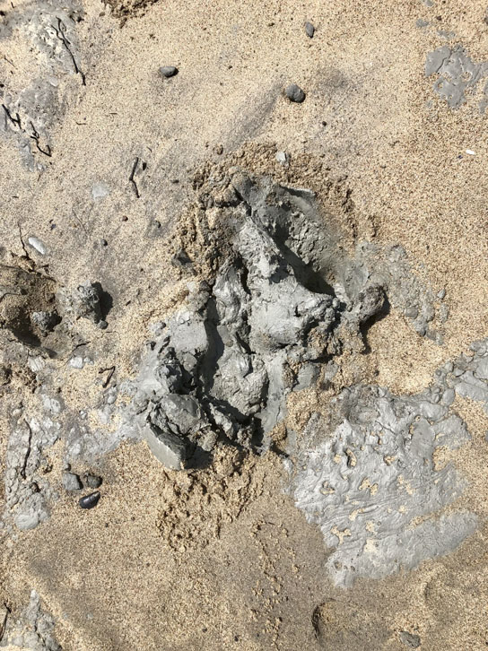 Lorsqu’on arrive au bon endroit sur la plage de Baie-St-Ludger, c’est le temps de faire ressortir doucement l’argile en tapotant le sol et de recouvrir tout son corps d’argile de Manicouagan! Bien sûr, n’apporter pas votre plus beau maillot de bain… 😉