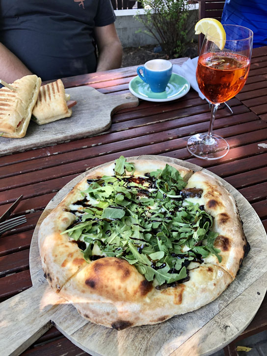 Les enfants ont dévoré leur pizza au fromage et, de mon côté, je dois avouer en toute sincérité que j’y ai mangé l’une des meilleures pizzas de ma vie: la Bianca. Il s’agit d’une pizza aux champignons rehaussée d’une sauce aux quatre fromages, avec asiago, fior di latte, huile de truffe, réduction de vinaigre balsamique et roquette.