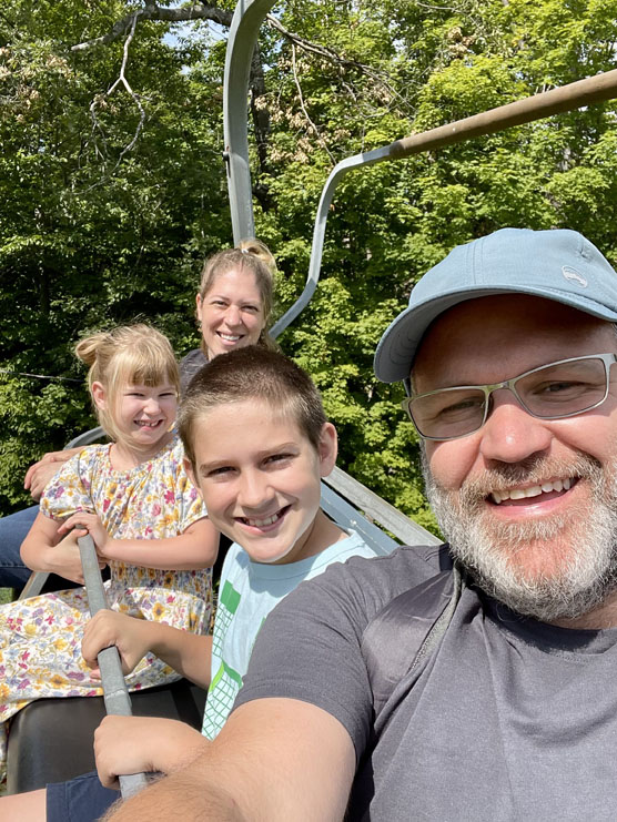 Ça fait tout drôle d’embarquer dans un télésiège en plein été! Rendus tout en haut de la montagne, avant de faire votre première descente, prenez le temps d’observer la jolie vue sur les collines du parc de la Gatineau.