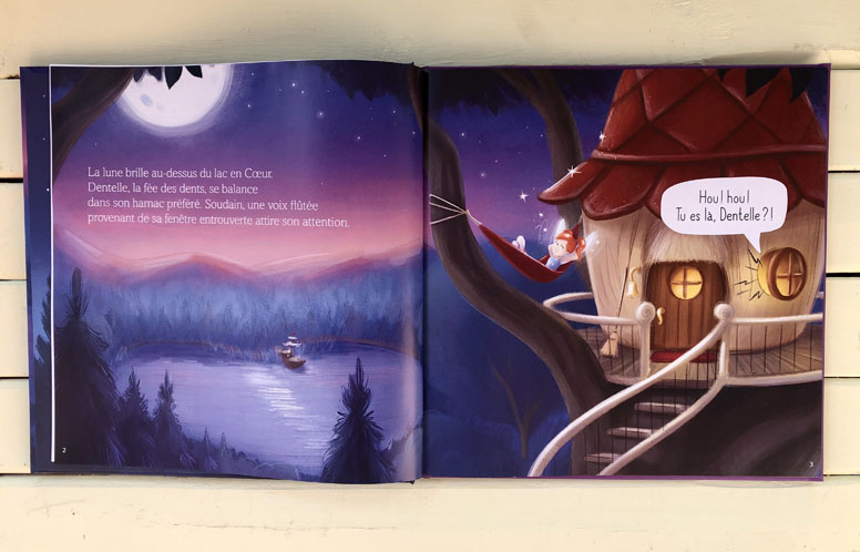 Le texte de Carolyn Chouinard nous présente l’histoire de Dentelle, la fée des dents, accompagnée de son assistant Parmesan, le souriceau. Alors que Dentelle doit aller récupérer la dent perdue d’un petit garçon qui fait du camping avec ses parents, elle se blesse et n’arrive plus à voler… Comment réussira-t-elle à accomplir sa mission malgré tout?
