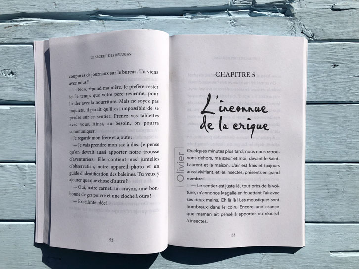 Publié chez Dominique et compagnie, Les enquêtes d’Olivier et Magalie: Le secret des bélugas est à la fois un roman, où l’on suit le voyage familial du frère et de la soeur aux Escoumins, et un livre qui plaira aux jeunes amateurs de documentaires animaliers. En effet, grâce au récit du séjour d’Olivier et de Magalie, nous avons le plaisir de revisiter plusieurs activités incontournables dans ce coin de la Côte-Nord, mais aussi de trouver plusieurs informations intéressantes sur les mammifères marins du Saint-Laurent, comme les rorquals, les bélugas et les narvals.