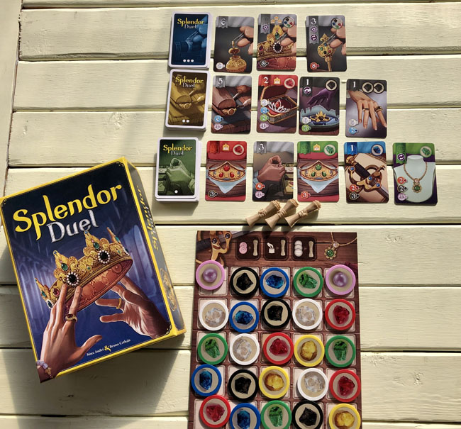 Avec Splendor Duel, ses créateurs proposent une nouvelle version plus compacte du jeu, mais aussi un peu plus complexe, avec différentes mécaniques. À l’idée de base de devoir remplir l’une des conditions de la carte Victoire pour gagner la partie, on a ajouté des figurines «Privilège», des «jokers», des couronnes et de nouvelles capacités sur les cartes Joaillerie. Toujours aussi amusant!