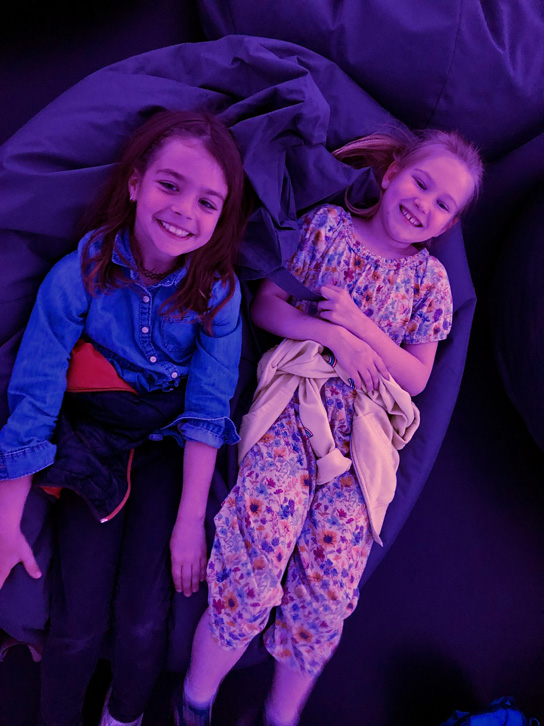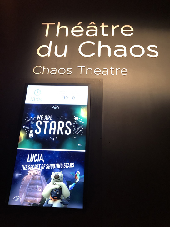 J’ignore pourquoi nous n’avions pas pris le temps d’aller au Planétarium plus tôt… Nous avons tellement adoré les deux films qui étaient présentés au Théâtre du Chaos, sur un écran en forme de dôme, au plafond, alors que nous étions couchées au sol sur des poufs!