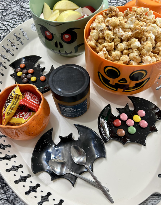 Chaque année, lorsque le temps le permet, je m’amuse à faire un dessert spécial pour célébrer l’Halloween durant le mois d’octobre. Après les brownies colorés et les biscuits au sucre décorés, c’est le popcorn au caramel qui est revenu en force, cette année. Et tant qu’à plonger dans le caramel, on mange aussi des morceaux de pommes avec le caramel de pomme au feu sacré de la Cidrerie Lacroix, dont on ne peut plus se passer!