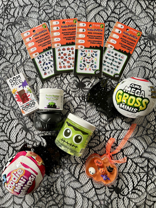 Cette année, on offre aux enfants quelques petites surprises selon l’inspiration du moment. On a trouvé des petits collants pour les ongles au Dollorama, des bagues d’Halloween chez Ardène et commandé des MiniBrands (des reproductions miniatures, idéales pour jouer avec des poupées). Pour le bain, on s’amuse avec des produits Gom-mee comme la poudre magique et la slime moussante Rhume de Frankenstein!