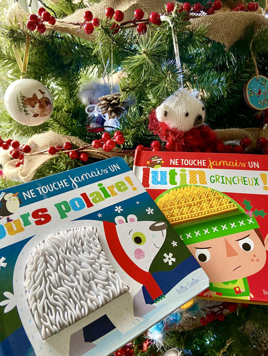 Pour les tout-petits jusqu’à 3 ans, les plus récentes adaptations de Marie-Eve aux éditions Petits Génies, avec des textures en silicone, font vraiment un merveilleux cadeau! Sur la thématique des fêtes et de l’hiver, on trouve maintenant en librairie Ne touche jamais un lutin grincheux et Ne touche jamais un ours polaire!