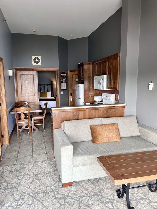 En plus d’une cuisine complète et d’un foyer, notre suite comprenait une chambre séparée ainsi que deux salles de bain: la totale. De plus, notre balcon nous donnait une belle vue sur le lac.