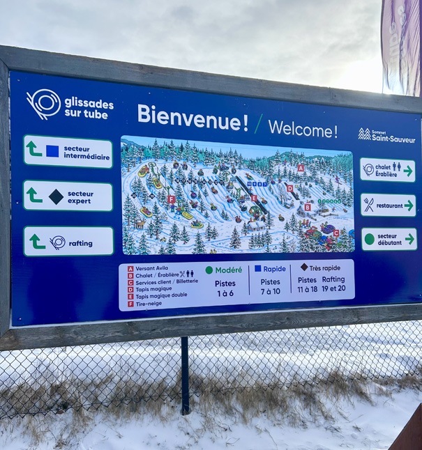 En temps normal, le centre de glissades sur tube du versant Avila propose 19 glissades (dont 2 pistes de rafting), mais comme Dame Nature n’avait pas été très généreuse en neige, au courant des semaines précédentes, il n’y en avait que trois, lorsque nous y sommes allés.