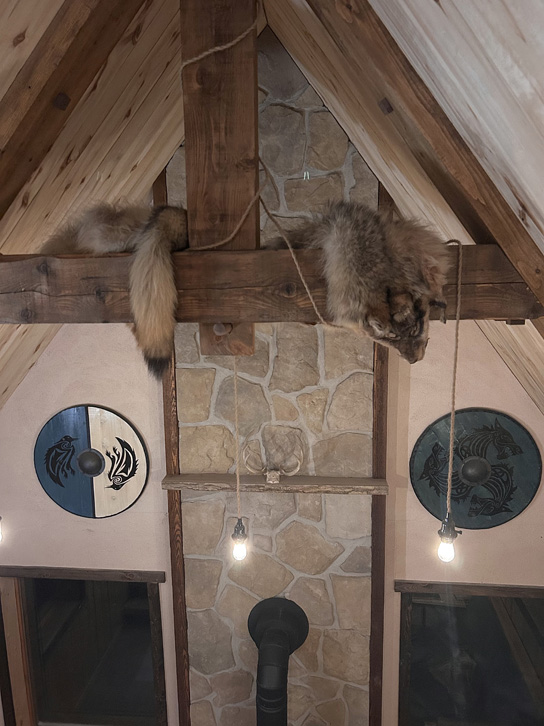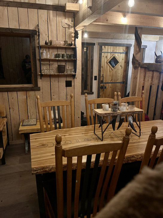 Nous avons été vraiment impressionnés par tous les détails sur place: la hache en guise de poignée de porte, les runes qui illuminent dans le noir (tant à l’extérieur de la maison que sur la table de la cuisine), des verres en cornes, un casque de Viking pour prendre des photos, des boucliers sur les murs, de la fourrure sur les rampes d’escalier… Quelles belles attentions pour nous transporter dans cet univers unique!