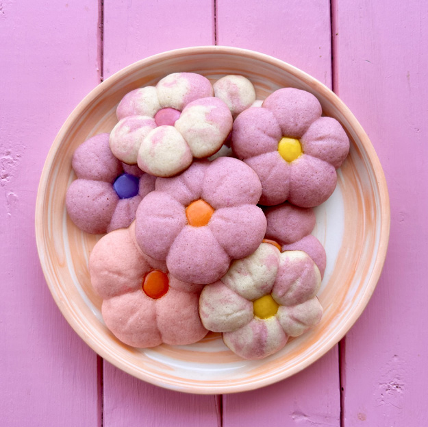 Nous avons également essayé une nouvelle façon, vue sur les médias sociaux, pour faire des biscuits en forme de fleurs. Voici le résultat! 😉