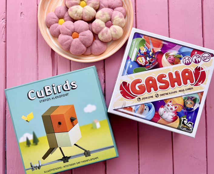 Quant à Gasha, il est inspiré des «machines à cocos» japonaises, les gashapons. L’objectif du jeu est d’accumuler des Gashas, en espérant obtenir les bons pour les échanger contre des «cartes Collection». Celles-ci peuvent rapporter des points, mais aussi des «jetons Bonus»: au terme de la partie, c’est le joueur avec le plus de points qui gagne.