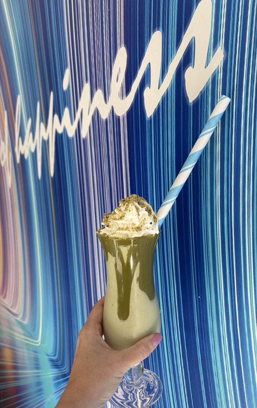 Nous avons opté pour la gaufre Dubaï au chocolat et à la pistache, qui était absolument décadente, accompagnée d’un milkshake, lui aussi à la pistache.