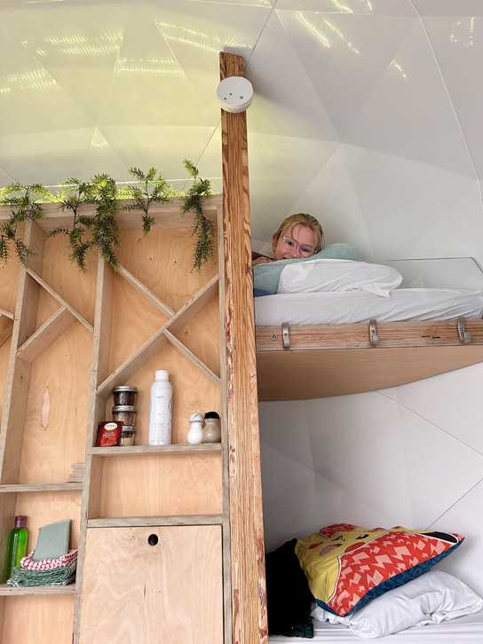 On y trouve notamment un espace cuisinette, une table à manger, deux grands lits doubles (dont un est situé à la mezzanine), des fauteuils pour relaxer ainsi qu’une toilette privée à incinération.