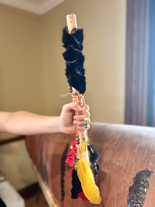Combinaison, entre autres, de cuir de chevreuil, de billes colorées, de plumes, de fourrure de vison et de tabac rustique, le bâton de parole est un symbole traditionnel de dialogues respectueux. Il était/est utilisé dans la communauté Wendat pour que tout le monde puisse équitablement avoir accès au droit de parole, mais vous comprendrez qu’il peut tout aussi bien être utilisé dans une famille. Une très belle expérience, qui a ouvert tout plein de belles discussions sur la communication entre nous.