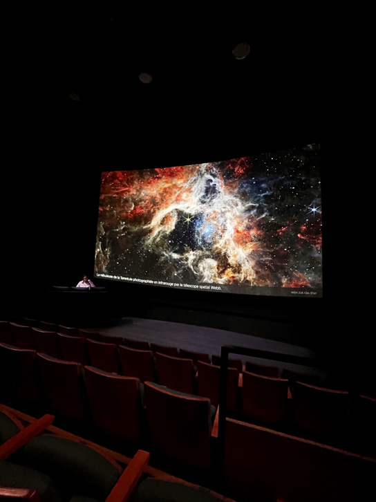 Toujours accompagnés, nous visitons d’abord la salle d’exposition « Du ciel étoilé à l’Univers infini », où l’on nous parle de l’évolution de notre conception de l’espace, pour ensuite nous rendre dans une salle multimédia, où l’on nous explique les phases de la Lune avant de regarder le film Émergence. C’est une belle opportunité pour poser des questions. La visite se poursuit dans le Cosmolab, où l’on profite d’une expérience de réalité virtuelle: nous avons beaucoup aimé (paraît-il qu’elle sera bientôt bonifiée).