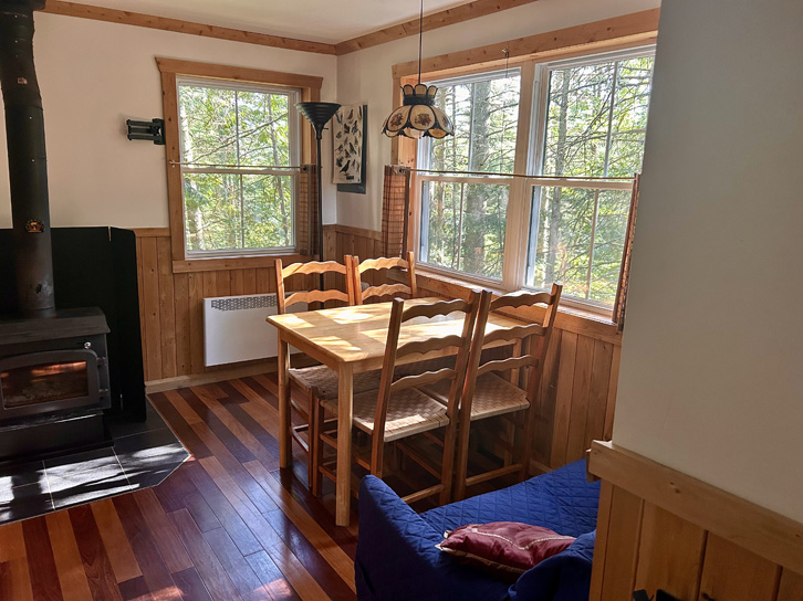 Nous avons vraiment apprécié l’ambiance chaleureuse de notre petit chalet surélevé, qui comprenait tout le nécessaire pour une famille de quatre, comme la nôtre: un coin cuisine, une salle à manger, un poêle à bois, une toilette intérieure privée ainsi que deux lits doubles, à l’étage.