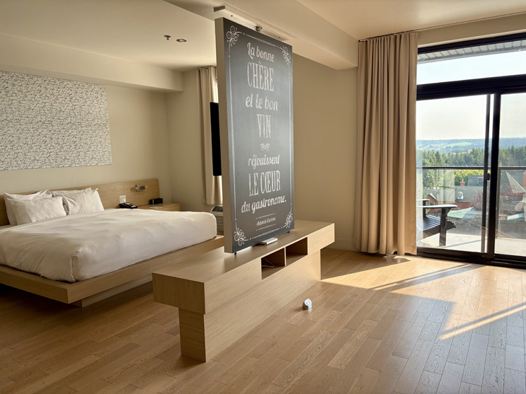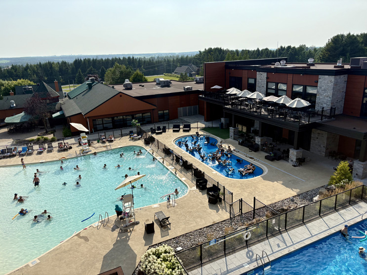 Cet endroit est un petit paradis pour la famille… ou pour les parents qui ont besoin de repos! On y trouve absolument tout, soit un hôtel, des chalets, des piscines, un bar, un restaurant, des chambres luxueuses, un spa, un vignoble et j’en passe. Lors de l’arrivée, ce sont les piscines qui volent la vedette. Une piscine plus traditionnelle, une où on y pose sa chaise pour se tremper les pieds et prendre un verre, puis une dernière dans laquelle on entre comme sur une plage. Vous pourrez y passer des heures à vous amuser.