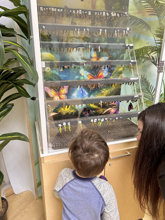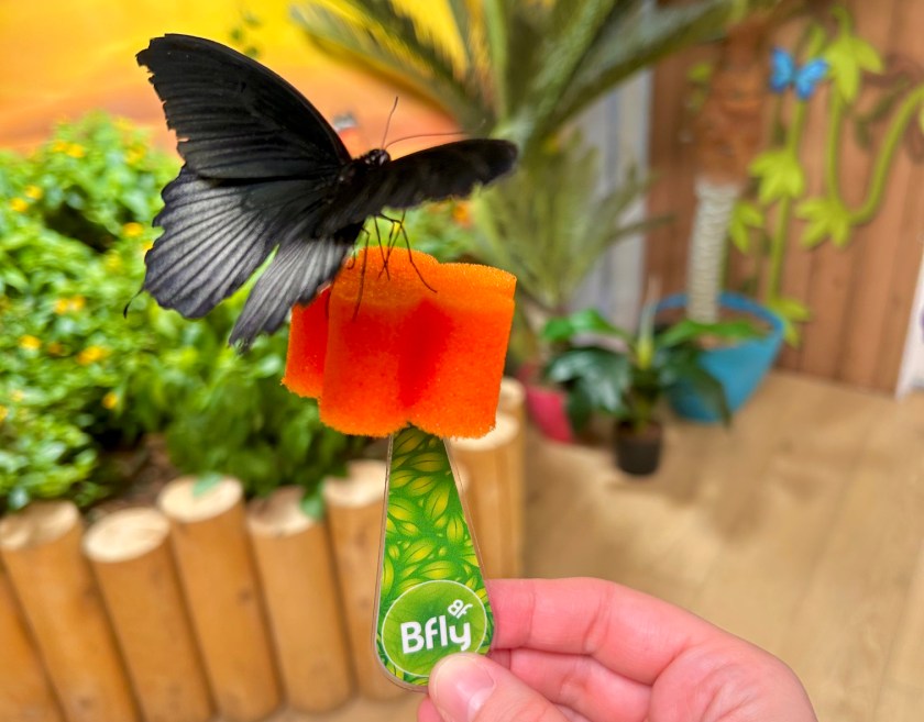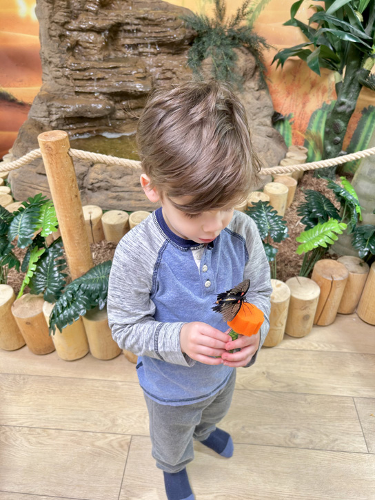 On trouve ensuite, bien sûr, « La volière magique », où l’on côtoie tout plein de papillons dans un environnement plus chaud et humide. Il est possible d’y approcher certains papillons doucement à l’aide d’un bâton-mousse contenant du nectar. Avec un peu de chance, vous y verrez peut-être, en direct, un papillon sortant directement de sa chrysalide!