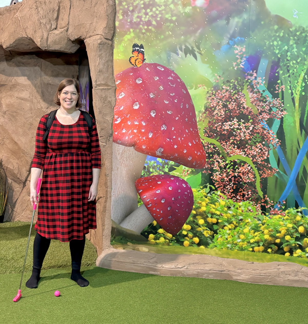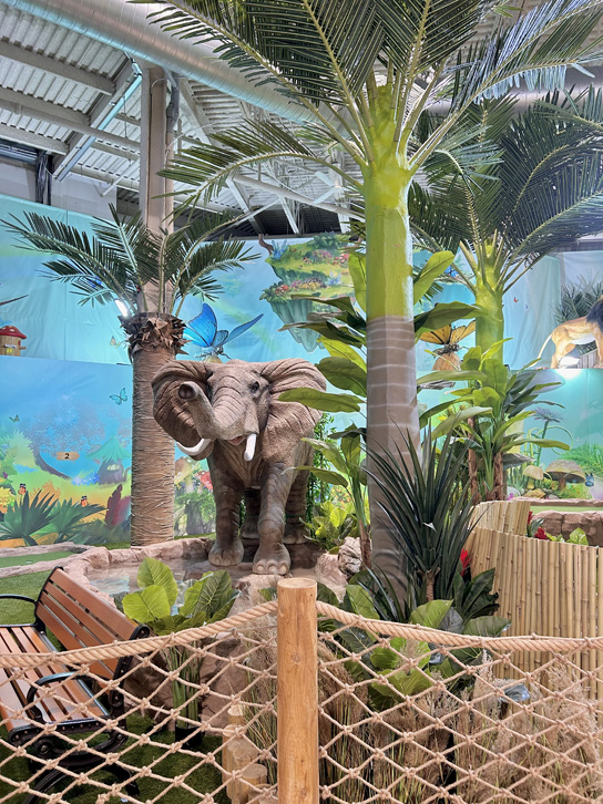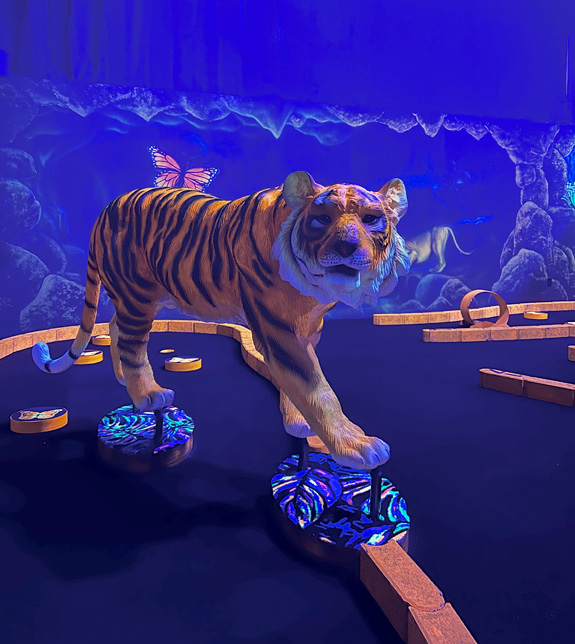 Juste à côté, un mini-golf intérieur de 18 trous vous attend, avec quelques grands animaux animés. La moitié du parcours se joue dans la pénombre, avec tout plein de détails fluorescents.