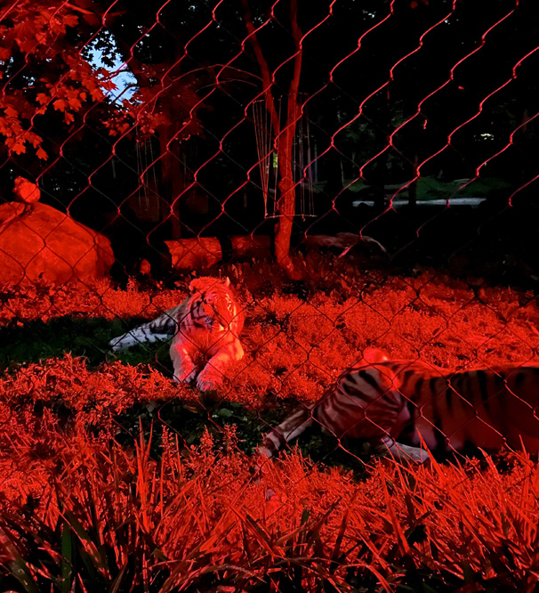 Présenté de 21h à minuit, du mercredi au samedi, le « Village Parallèle » n’est pas animé par des comédiens, mais plutôt par des jeux de lumières, de sons et de projections vidéos. C’est une expérience immersive vraiment originale, où l’on déambule à notre guise dans le Village et où il est possible d’entrer dans certains bâtiments où la réalité est drôlement déformée.