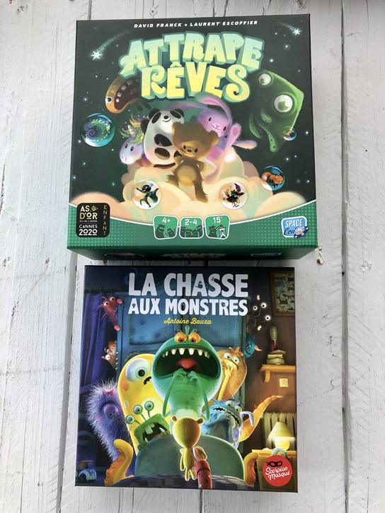 Voilà deux autres jeux qui ont beaucoup de succès chez nous! Ils s’adressent aux plus jeunes de 3 ans et plus, mais ils sont vraiment agréables à jouer en famille. Dans Attrape-Rêves, il faut tenter d’évaluer quelle grandeur de doudou peut recouvrir le cauchemar qui vient de se produire. À chaque fois que l’on réussit, on pige des jetons de rêves dans l’oreiller et on doit inventer une histoire à partir de ceux-ci: cela donne lieu à de beaux moments et développe l’imagination de tout le monde!