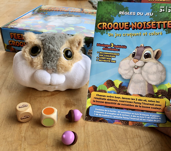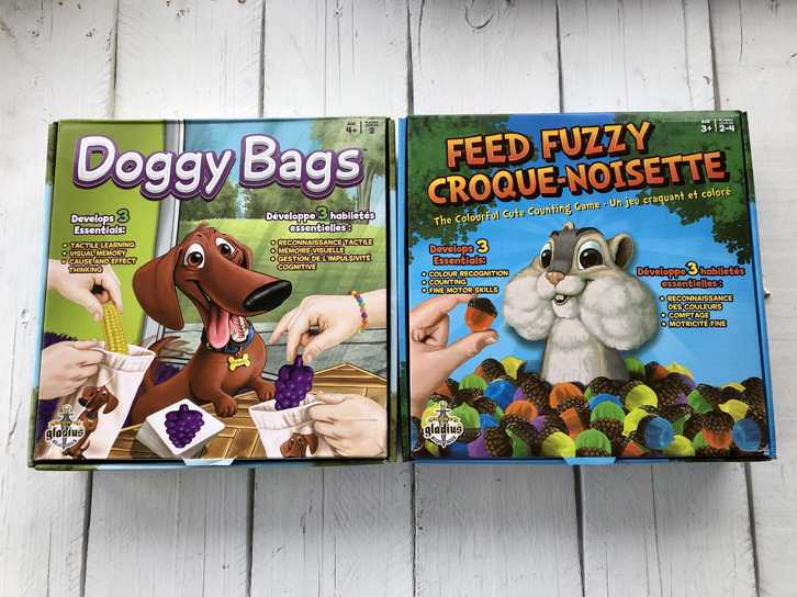 Dans Doggy Bags, on joue à identifier, le plus rapidement possible, l’aliment demandé par Franky le chien, en pigeant dans notre sac sans regarder. Dans Croque-Noisette, votre enfant s’habituera à identifier les couleurs, à utiliser un dé et à compter, tout en ayant beaucoup de plaisir à nourrir Fuzzy l’écureuil. On les adore!