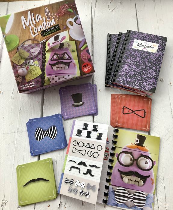Dans Mia London, nous incarnons des détectives qui essaient de découvrir quelle fripouille a commis un méfait. Pour ce faire, il faut bien observer les cartes de chapeaux, de lunettes, de moustaches et de noeuds papillons qui défilent, dans le but de trouver celles qui n’apparaissent pas deux fois. (On retire préalablement, au hasard, les quatre cartes manquantes identifiant le coupable.) Comme tous les jeux de Scorpion masqué, les illustrations sont vraiment belles!