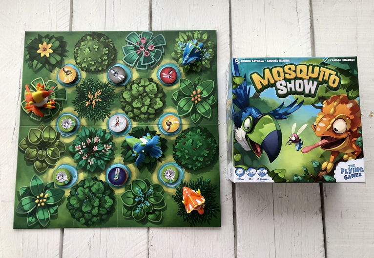 On a un véritable coup de coeur pour ce nouveau jeu qui est paru l’été dernier chez The Flying Games! Il s’adresse principalement aux jeunes de 8 ans et plus, mais ne sous-estimez pas la curiosité de vos plus petits, car ma fille de 5 ans arrive également à y jouer. Le but de Mosquito Show est de battre son adversaire, soit en le bloquant, soit en réussissant à être le premier à manger 9 moustiques dorés. Il faut apprendre à se familiariser avec les mouvements de notre toucan et de notre caméléon, tout en usant de stratégie et en effectuant les pouvoirs imposés par chaque type de moustique que l’on mange. Vraiment amusant!